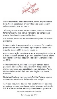 Vilma conclui que as “forças populares” defenderão Lula, a democracia, e as conquistas do governo dele.