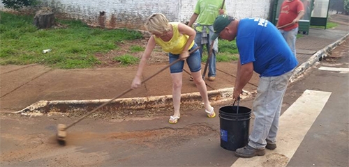 A prefeita Angela Kraus não ficou só olhando, não, na hora de conferir os trabalhos da operação tapa-buraco pelas ruas de Farol. Pegou o vassourão e ajudou a limpar os buracos antes da colocação das pedras e do piche. Segundo ela, as chuvas dos últimos dias prejudicou o asfalto e em algumas ruas será preciso contratar uma empresa especializada.