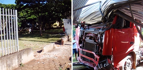 Caminhão e perímetro urbano não combinam, certo? Pois olha o que aconteceu por volta das 18h deste sábado, em Mamborê. Motorista de caminhão Volvo perdeu o controle ao fazer um curva, derrubou muro, passou por cima de árvore e só parou ao bater na entrada do salão paroquial da Paróquia Imaculada Conceição. O motorista fugiu e um rapaz que estava com ele ficou ferido, mas sem risco. Diante do que poderia ter acontecido, dá pra dizer que foi "milagre da Imaculada Conceição"...