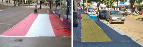 Virou moda em Campo Mourão lojistas forrarem suas calçadas com “tapetes”. Esses aí foram clicados na av. Manoel Mendes de Camargo. Repare que, à direita são duas lojas seguidas “entapetadas”. Há quem goste, há quem ache brega, há quem ache pura poluição visual e há quem pergunte: e como é que fica o piso podotátil?...