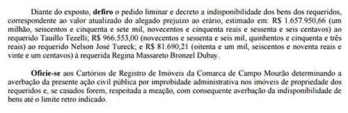 Gabriela Borri Aranda, juíza da 1ª Cível de Campo Mourão, em trecho do despacho que definiu a indisponibilidade dos bens.