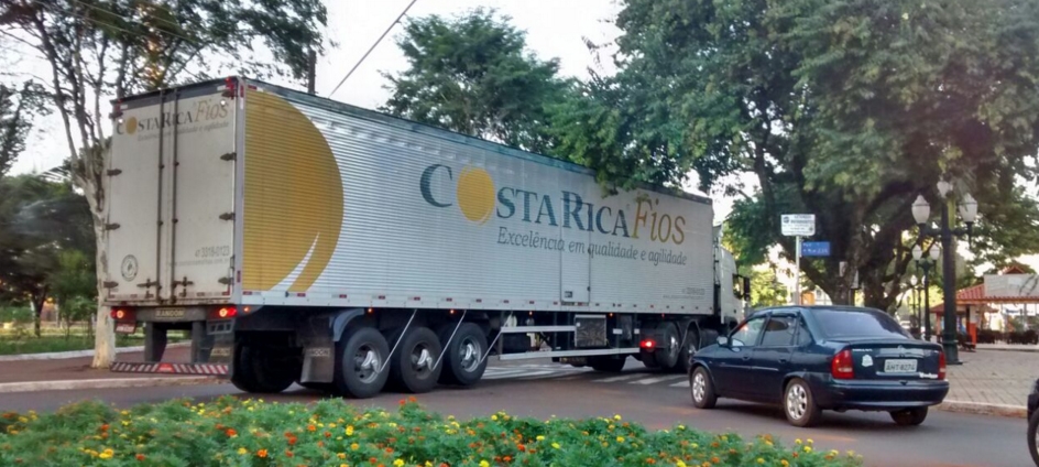 Carreta passa pela av. Capitão Índio Bandeira, no centrão de Campo Mourão. Para conseguir fazer o contorno, entrou pela contramão. Que beleza!