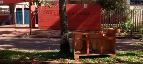 Vai uma pia aí? Tá faltando portas, gavetas e a pedra, mas na pior das hipóteses serve como lenha. Interessados buscar na av. Guilherme de Paula Xavier, em frente ao Colégio Estadual (a pichação “porcos”, que aparece ao fundo veio bem a calhar”).