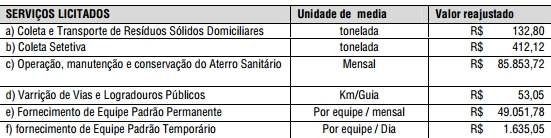 A varrição de ruas passa para R$ 53,05 o km/guia e a operação do aterro sanitário R$ 85,8 mil mensais.