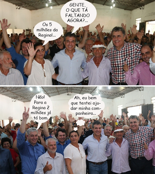 Os cliques são desta quinta-feira, em Iretama, onde houve entrega de 70 casas rurais com a presença do governador Beto Richa. Agora, cá pra nós: o que será que foi falado para a prefeita Filó Saab mostrar cinco dedos e o secretário de Estado Douglas Fabrício (Esporte e Turismo) só dois? E Filó ainda olhou descofiada par ao secretário. Mistéééééério...