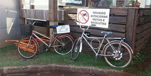 Placa em supermercado de Campo Mourão deixa claro que não se pode deixar motos e bicicletas por ali. Parece que teve gente que não entendeu.