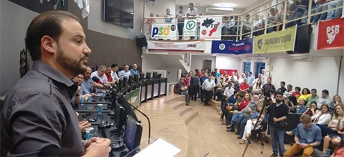 Rodrigo Salvadori (PSD), vice-prefeito de Campo Mourão, ao discursar durante a convenção que confirmou seu nome como candidato a prefeito; neste domingo, na Câmara.