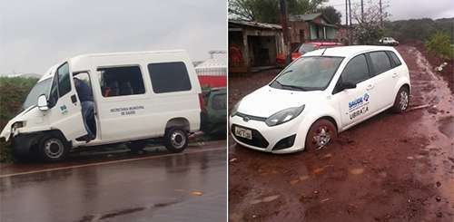 A segunda-feira não estava para carros oficiais de prefeituras da região. Pouco antes das 7h, um van de Goioerê que levava pacientes para Cascavel bateu em outra van na BR-369, perto de Corbélia. Das 12 pessoas que estavam sendo transportadas, cinco se feriram. Já à tarde, em Ubiratã, o carro da Secretaria de Saúde acabou encalhado ao passar por rua sem asfalto no jardim São Joaquim