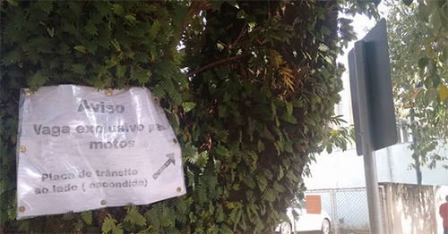 Na rua São Paulo, entre as avenidas Capitão Índio Bandeira e Irmãos Pereira, a placa de trânsito ganhou um “reforço”. O cartaz afixado na árvore “avisa” que o local é exclusivo para estacionamento de motos e aponta para a placa ao lado, que fica escondida pela árvore. Detalhe: o cartaz de reforço foi feito no capricho, emplastificado e tudo, para resistir à ações do tempo.