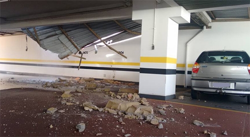 Pedaços de concreto caíram sobre a garagem do prédio. Não havia nenhum carro no local atingido, mas o telhado da garagem foi destruído. Ninguém se feriu. Além do pessoal que trabalha no prédio, o barulho assustou quem passava pelo calçadão.