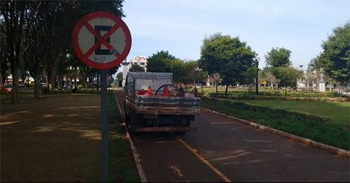 A placa é clara: no trecho que corta a praça São José, não é permitido parar nem estacionar na rua Brasil. E ainda tem um “pedestre” escrito em letras garrafais no chão. Mesmo assim, teve caminhão que passou a manhã desta sexta-feira no local, numa boa.