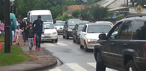“Foto de frente da escola Monteiro Lobato, no Lar paraná. A prefeitura colocou uma placa de proibido estacionar, mas os motoristas ignoram. Todo dia se repete a mesma coisa”.