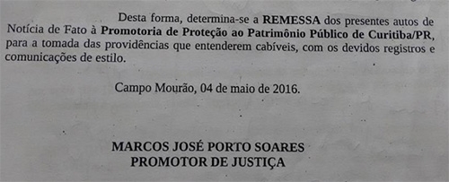 O MP de Campo Mourão encaminhou o caso para ser analisado pela promotoria de Curitiba.