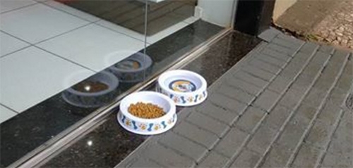 Na rua Harrison José Borges, centro de Campo Mourão, empresa mantém recipientes com água e ração para cachorros de rua.