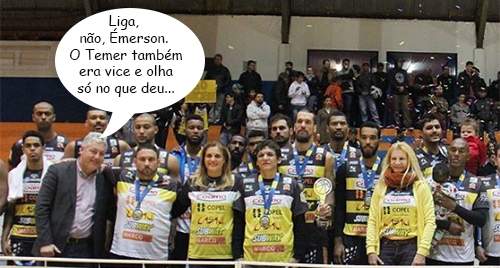 O clic é da solenidade de premiação da Liga Ouro de Basquete, sexta-feira. Campo Mourão ficou com o vice-campeonato, o que não é pouca coisa. O título foi para o Vasco. Na hora da foto oficial, com as medalhas de prata, o técnico Émerson de Souza ficou entre o secretário de Estado Douglas Fabrício (Esporte e Turismo) e a prefeita Regina Dubay (que um dia já foi vice).