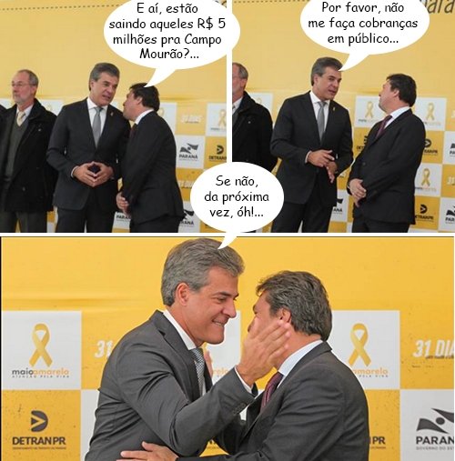 Os cliques são desta segunda-feira, em Curitiba, onde o governo do Estado fez o lançamento da campanha “Maio Amarelo”, que objetiva a conscientização para evitar acidentes de trânsito. O governador Beto Richa participou. O deputado estadual Márcio Nunes também. Pelo visto, eles aproveitaram para colocar a conversa em dia. E, calma, gente! Foi só uma abraço caloroso...