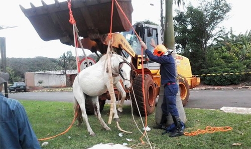 O Corpo de Bombeiros de Goioerê fez um atendimento diferente nesta sexta-feira. Uma égua teve de ser retirada de um bueiro, no jardim Lindóia. O animal ficou com uma perna presa, depois da tampa do bueiro quebrar. Foi preciso usar uma pá-carregadeira de prefeitura. A égua, que puxava uma carroça, teve apenas ferimentos na perna, sem maior gravidade, e após o socorro foi levada para casa por seu proprietário.