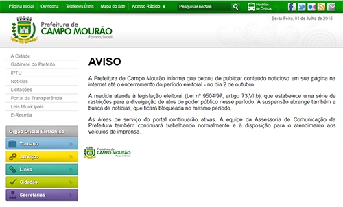 Com a legislação eleitoral mais rigorosa, as prefeituras não podem mais nem manter notícias da administração na página oficial do município. Olha só como ficou o portal da prefeitura de Campo Mourão. Ao invés do noticiário, o aviso de que a página só volta ao normal depois das eleições, em outubro. Nem o sistema de busca de notícias funciona.