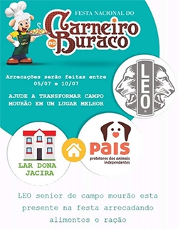 Quem for ao Parque de Exposições durante os seis dias da 26ª Festa Nacional do Carneiro no Buraco também pode fazer sua “boa ação”. Para isso, basta levar alimentos não perecíveis e/ou ração para cães. A arrecadação será feita pelo Leo Clube (Lions), com uma barraca montada ao lado do portão principal. Os alimentos serão repassados para o Lar Dona Jacira e a ração para a Pais.