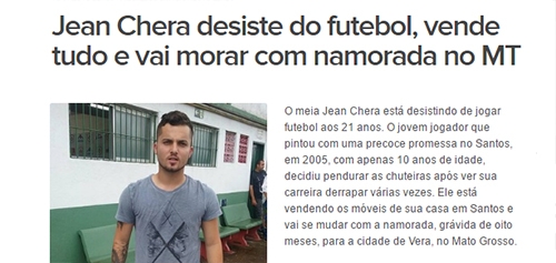 Olha Jean Chera, o “menino fenômeno da Adap”, outra vez no noticiário nacional. Desta vez a notícia é que, aos 21 anos, ele desistiu do futebol. Pôs tudo à venda em Santos e se mudou para Vera/MT. Chera ganhou fama nacional aos 9 anos, quando estava na Adap de Campo Mourão.