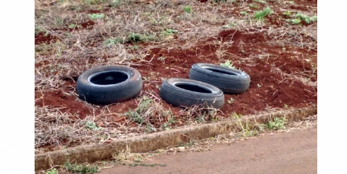 “Pneus jogados em terreno baldio na rua Vereador Geremias Cilião Araújo, entre as ruas João B. Perdoncini e Admar F. Caldas. Estão lá há dias...”