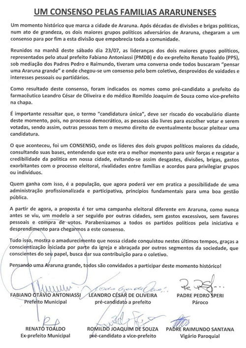 Uma carta foi assinada pelo prefeito Fabiano Antoniassi (PMDB), pelo ex-prefeito Renato Toaldo (PPS), pelos padres e pelos pré-candidatos.