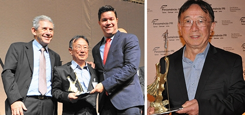 O empresário Clineu Uehara (Fruto Maduro) recebeu nesta sexta-feira, em Curitiba, o troféu Guerreiro do Comércio. A homenagem foi entregue pela Fecomércio a 47 empresários do Estado. Uehara subiu ao palco acompanhado do presidente do Sindicato Empresarial do Comércio de Campo Mourão e Região, Nelson Bizoto. Uma caravana com cerca de 40 pessoas de Campo Mourão acompanhou o evento.