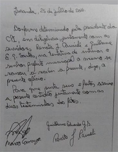 Junto ao ofício, a Câmara anexou declaração de servidores dizendo que Batista “se recusou a receber” o documento.
