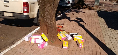 O que é isso? Um pé de caixa de sábado? Até parece, porque a cena é comum pelo centro de Campo Mourão: caixas de sapatos “deixadas” ao pé de árvores públicas. Essas aí estão no calçadão. Deve ser caixas que “amadureceram” e caíram no pé, né?...