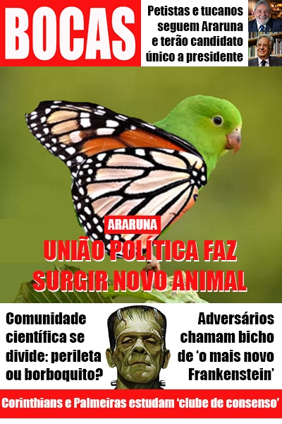 Nova edição da revista Bocas, aquela que só tem a capa, destaca a inusitada aliança entre periquitos e borboletas, dois grupos rivias da política de Araruna, para as eleições deste ano.