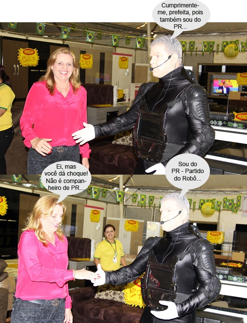 Os cliques são desta sexta-feira, logo após a abertura do Feirão do Comércio, na praça São José. A prefeita Regina Dubay (do Partido da República) esteve por lá e ao conferir as ofertas se deparou com um "robô". O que ela não esperava era levar um choque de brincadeira na hora de cumprimentar o ser cibernético. Ah, deve ser de oposição esse robô, só pode...