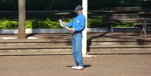 "Mesmo com sol forte, cidadão lê jornal, em pé, no meio da praça São José, no centro de Campo Mourão".