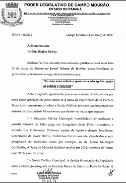 No ofício, Nespolo diz que é "inconcebível" que prefeita e presidente da Câmara "não possuam uma boa relação".