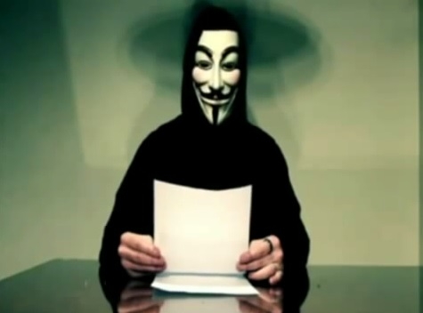 Só que o apresentador não é ninguém da cidade, não. A imagem original vem de outros vídeos do Youtube, de um grupo chamado "Anonymous" (reprodução à direita). Aí foi só fazer a dublagem, o que foi bem fácil, já que a máscara não abre a boca e, portanto, não é necessário sincronismo com o som.