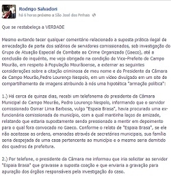Rodrigo Salvadori (SDD), vice-prefeito de Campo Mourão, em nota divulgada nesta terça-feira, após veiculação de vídeo do Youtube em que o acusa de armação política contra a prefeita Regina Dubay (PR).