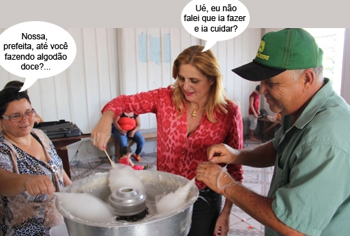Olha aí a prefeita Regina Dubay ajudando a preparar algodão doce. Foi nesta segunda-feira, durante a da festa da Páscoa no jardim Tropical. O evento foi promovido pelo presidente da Associação de Moradores, Francisco de Assis, e contou com diversas atividades e entrega de doces e chocolates para as crianças do bairro. As doações foram feitas por voluntários e empresários da cidade.