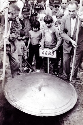 Olha só o que o fotógrafo Salvador do Prado foi achar no fundo do baú. A foto da retirada do primeiro tacho da 1.a Festa do Carneiro no Buraco, em 1991. O então prefeito Augustinho Vecchi e o mestre-cuca Tony Nishimura (já falecido) fazem a retirada. Vecchi será o presidente de honra da festa deste ano. Repare que o tacho era da AABB. Nas primeiras edições, cada entidade fazia seu próprio carneiro. Havia até um concurso para escolher qual entidade tinha feito o prato mais saboroso. Só mais tarde se criou a cozinha úlnica.