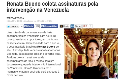 A deputada ítalo-mourãoense Renata Bueno foi notícia na coluna de Felipe Patury, da revista "Época". Motivo? A coleta de assinaturas de parlamentares de todo o mundo para pedido de intervenção internacional na Venezuela. A ideia é entregar o abaixo-assinado à Corte de Haia. Em tempo: Renata representa o parlamento da Itália. Imagine se fosse dos "States"...