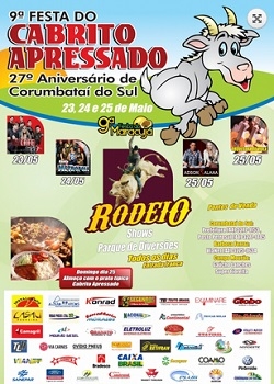 Definida a comissão organizadora da 9ª Festa do Cabrito Apressado e dos festejos pelos 27 anos de Corumbataí do Sul. A presidência ficou com Alessandro Damas Fiorderize. O vice-prefeito Xandão Donato será o coordenador do prato típico. A portaria do prefeito Carlos Caxão diz que a comissão terá 30 dias para apresentar a prestação de contas do evento. A festança será realizada de 23 a 25 de maio. Os shows e o rodeio terão entrada gratuita. O cabrito apressado custará R$ 30. E pode comer sem pressa, viu?...
