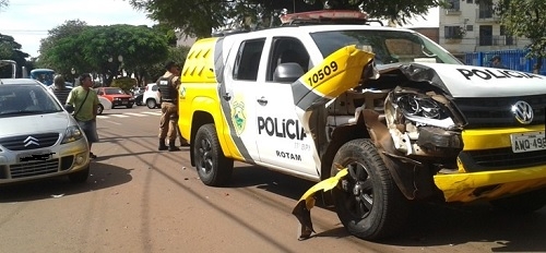 Acidente no centro de Campo Mourão, nesta sexta-feira, envolveu uma viatura da Polícia Militar e outros dois carros. Um Palio teria cruzado a preferencial na rua Rocha Pombo e a viatura, para desviar, acabou atingindo dois veículos que estavam estacionados. Isso na av. Capitão Índio Bandeira. Ah, quando a gente diz que tem que mandar benzer essas viaturas novas...