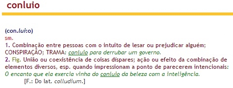 Segundo o dicionário Aulete, é "combinação entre pessoas com o intuito de lesar ou prejudicar alguém".