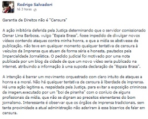 No Facebook, Rodrigo Salvadori chamou de "bizarrice" o uso do termo censura para sua ação inibitória.
