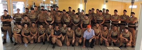 Os 45 novos soldados da Polícia Militar de Campo Mourão participaram de uma manhã de treinamento na Fiorella e foram recepcionados com um café da manhã. "Clamamos por segurança e devemos dar nosso apoio a estes jovens nesta nobre missão", frisou o empresário Geraldo dos Santos. Em tempo: Geraldo é o único civil (sem farda) que aparece na foto. Se bem que, de longe, o boné da Fiorella tá parecendo uma boina vermelha...