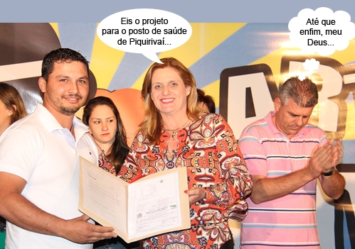 Olha aí mais um clic da programação de aniversário do distrito de Piquirivaí, que completou 48 anos na terça-feira. Desta vez, a prefeita Regina Dubay aparece entregando ao presidente da Associação de Moradores, Diego Rodolfo Raimundo, cópia do projeto do posto de saúde que será construído por lá. Ao lado está o vereador Edílson Martins.