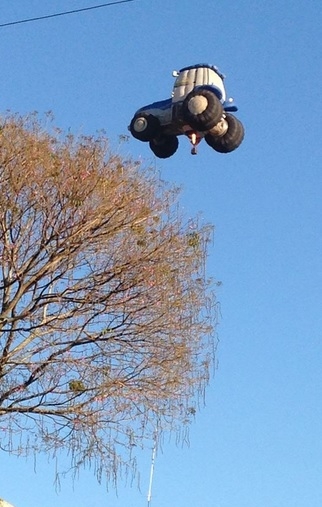 É um pássaro? É um avião? Não! É "só" um tratorzão voando pelos céus de Campo Mourão. A cena é desta quinta-feira pela manhã. Portanto, vaca que voa a gente ainda não viu, mas trator já apareceu...