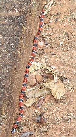 "Foto feita na estrada que leva ao viveiro do Parque Estadual Lago Azul de Campo Mourão, belíssima cobra coral".