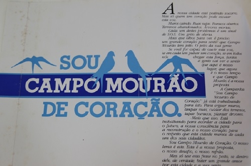 Essa quem está na casa dos 40 vai lembrar. É uma peça da campanha "Sou Campo Mourão de Coração", lançada pela prefeitura na gestão de Augustinho Vecchi (89/92). Entre outras coisas, a campanha pedia a participação dos moradores para deixar a cidade mais bonita. "A nossa cidade está pedindo socorro", frisava a abertura do texto. Hummmmmm...