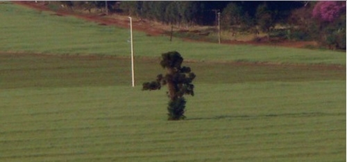 Numa área rural próxima ao perímetro urbano (tão próxima que o clic foi feito no alto do edifício Likes) uma árvore em meio à lavoura dá asas à imaginação. Seria um astronauta ou um aplicar de veneno? Ou você vê outra coisa nessa figura?...