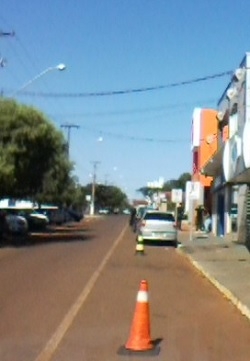 "Resolvi tirar esta foto e mandar porque não aguento mais ver esta imagem. Em horário comercial, loja coloca este cones na rua como fosse dela parte desta avenida. O local fica bem no centro de Mamborê". Paula