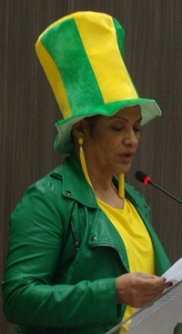 A vereadora Professora Vilma foi à sessão da Câmara desta segunda-feira toda vestida de verde e amarelo.